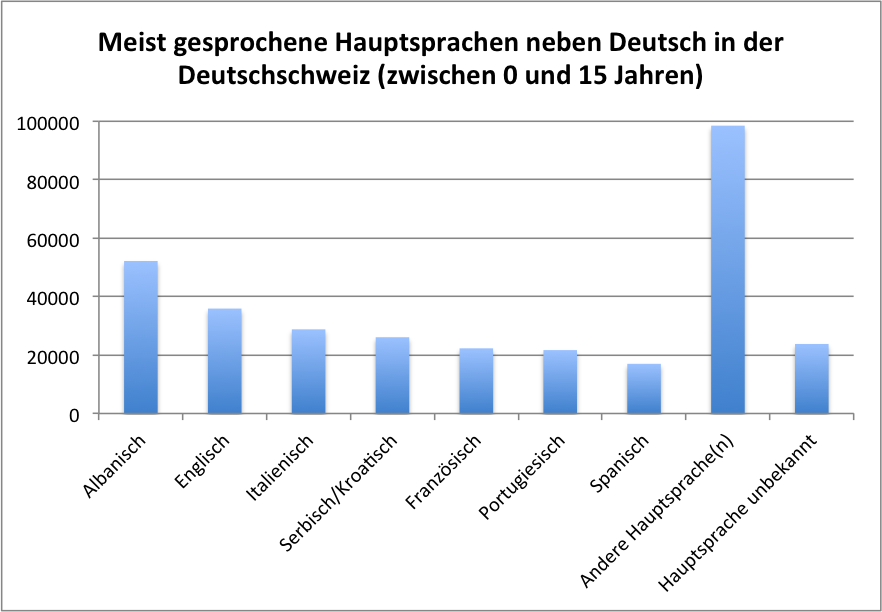 Da die "Anderen Hauptsprachen" in dieser Statistik nicht aufgeschlüsselt sind, wurde ebenfalls die Statistik zu den meistgesprochenen Sprachen in der Deutschschweiz ab 15 Jahren betrachtet.