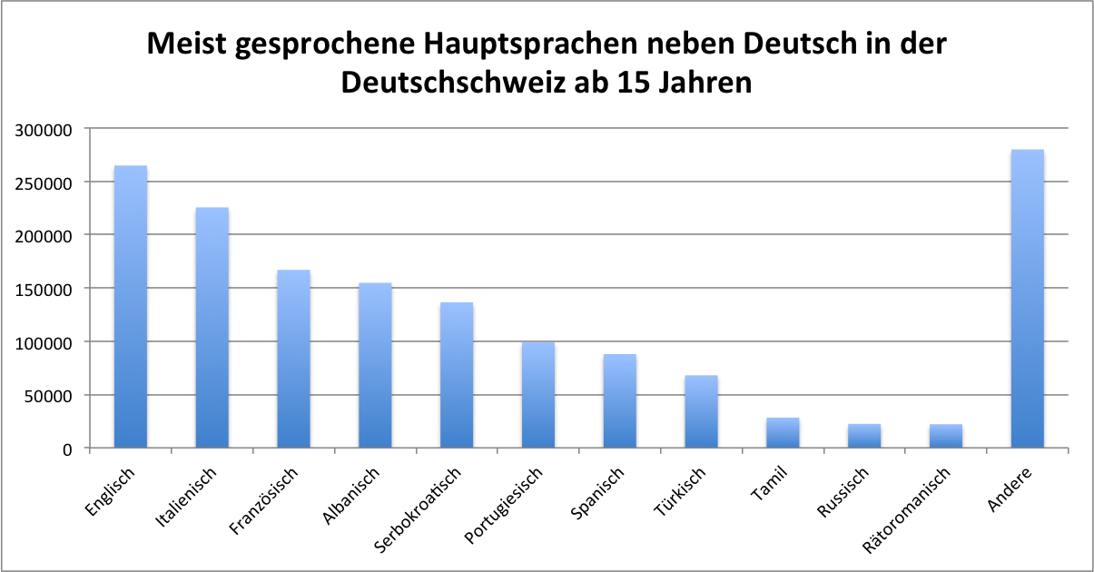 Da die "Anderen Hauptsprachen" in dieser Statistik nicht aufgeschlüsselt sind, wurde ebenfalls die Statistik zu den meistgesprochenen Sprachen in der Deutschschweiz ab 15 Jahren betrachtet.