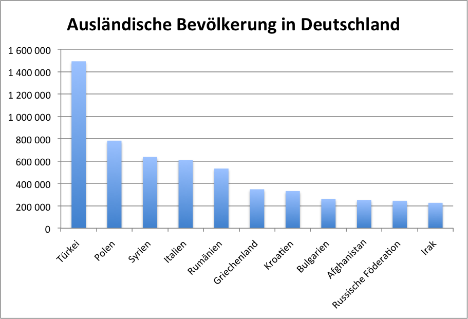 Für Deutschland gibt es keine vergleichbare Statistik. Zur Ermittlung der Sprachen wurde die Statistik der ausländischen Bevölkerung nach Herkunftsland im Jahr 2016 herbeigezogen. Angezeigt werden die elf häufigsten Herkunftsländer: