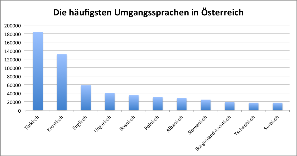 Für Österreich wurde die Statistik zu den gesprochenen Umgangsprachen im 2001 verwendet. In dieser Statistik wurde allerdings das Alter der Bevölkerung nicht beachtet. Gezeigt werden die 11 meist gesprochenen Umgangssprachen neben Deutsch: